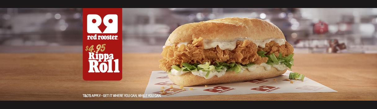 Roll in to Red Rooster for a $4.95 Rippa Roll: two tenders fried to perfection, served in a crunchy roll with fresh lettuce and signature herbed mayo.